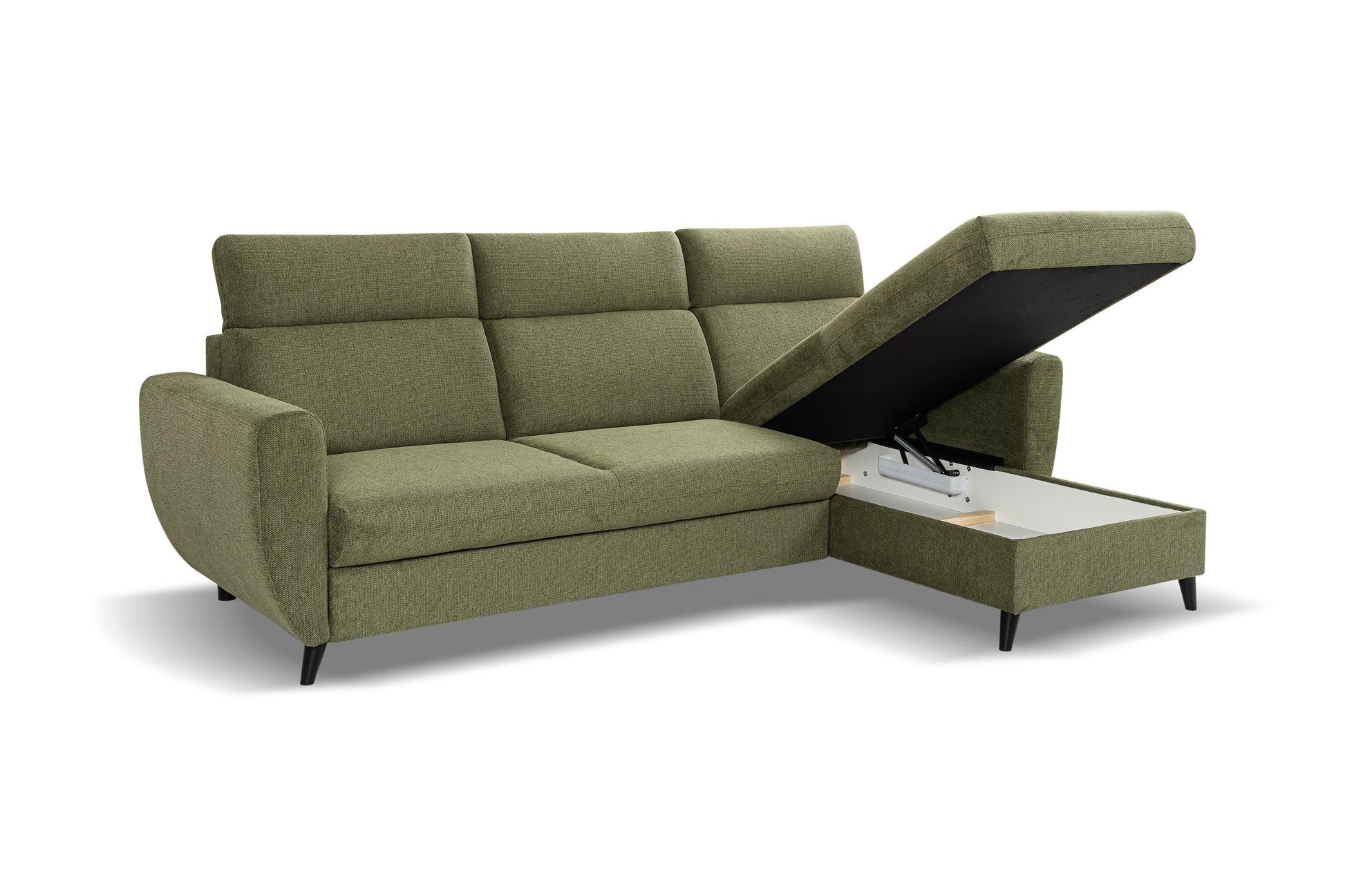 Sofaen er udstyret med både sengeudtræk og opbevaringsrum, hvilket gør den ideel til mindre boliger, gæsteværelser eller stuer, hvor fleksibilitet er vigtig.